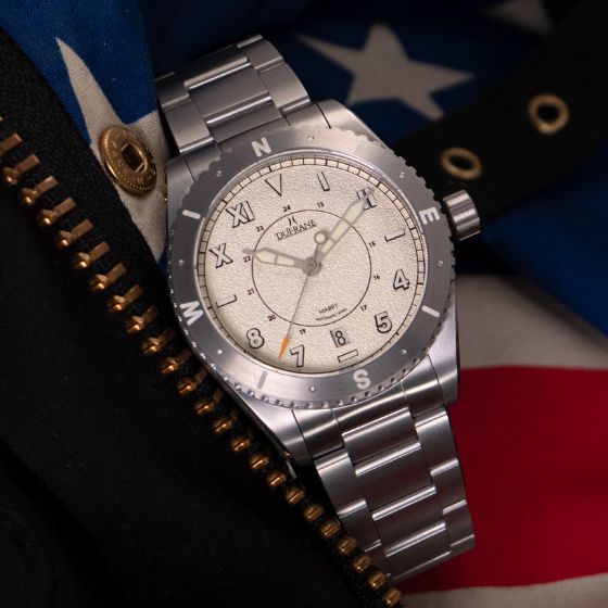 Available with or without a date window, and shipping with a super comfortable 5-link, solid end link bracelet and a FKM (Fluorine Kautschuk Material) rubber strap. Each piece is assembled, timed and tested here in my Austin shop.