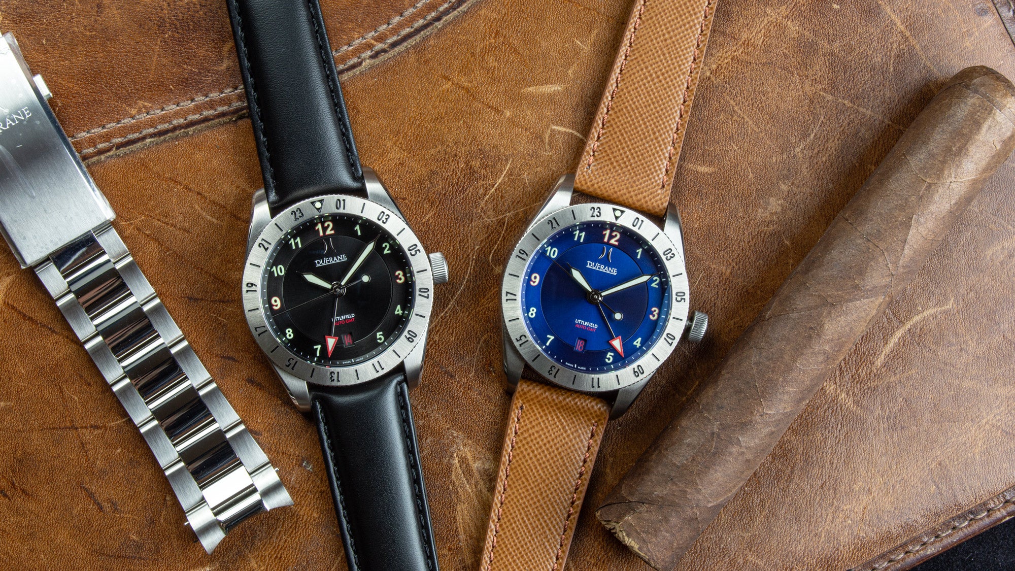 Includes both a solid end link bracelet and a curved full grain leather strap.