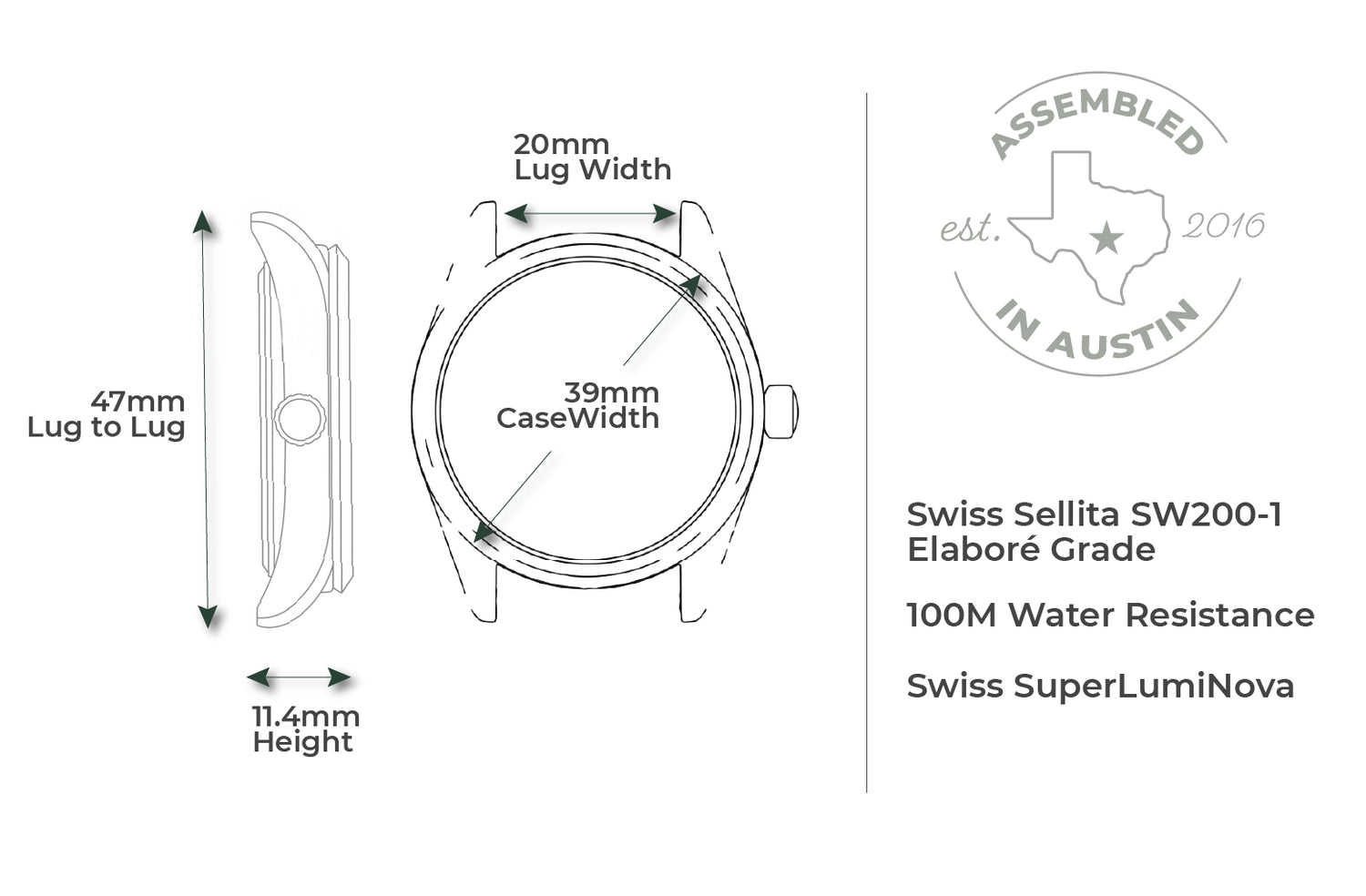 Every watch is designed and assembled by me, right here in Austin, TX. I regulate each movement and test all pieces before they are deemed ready for your wrist.